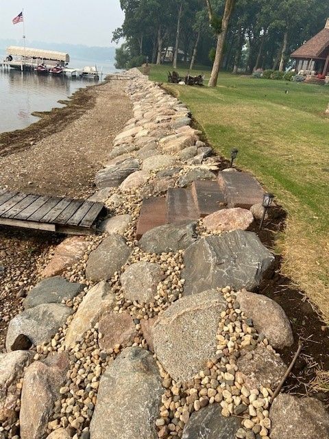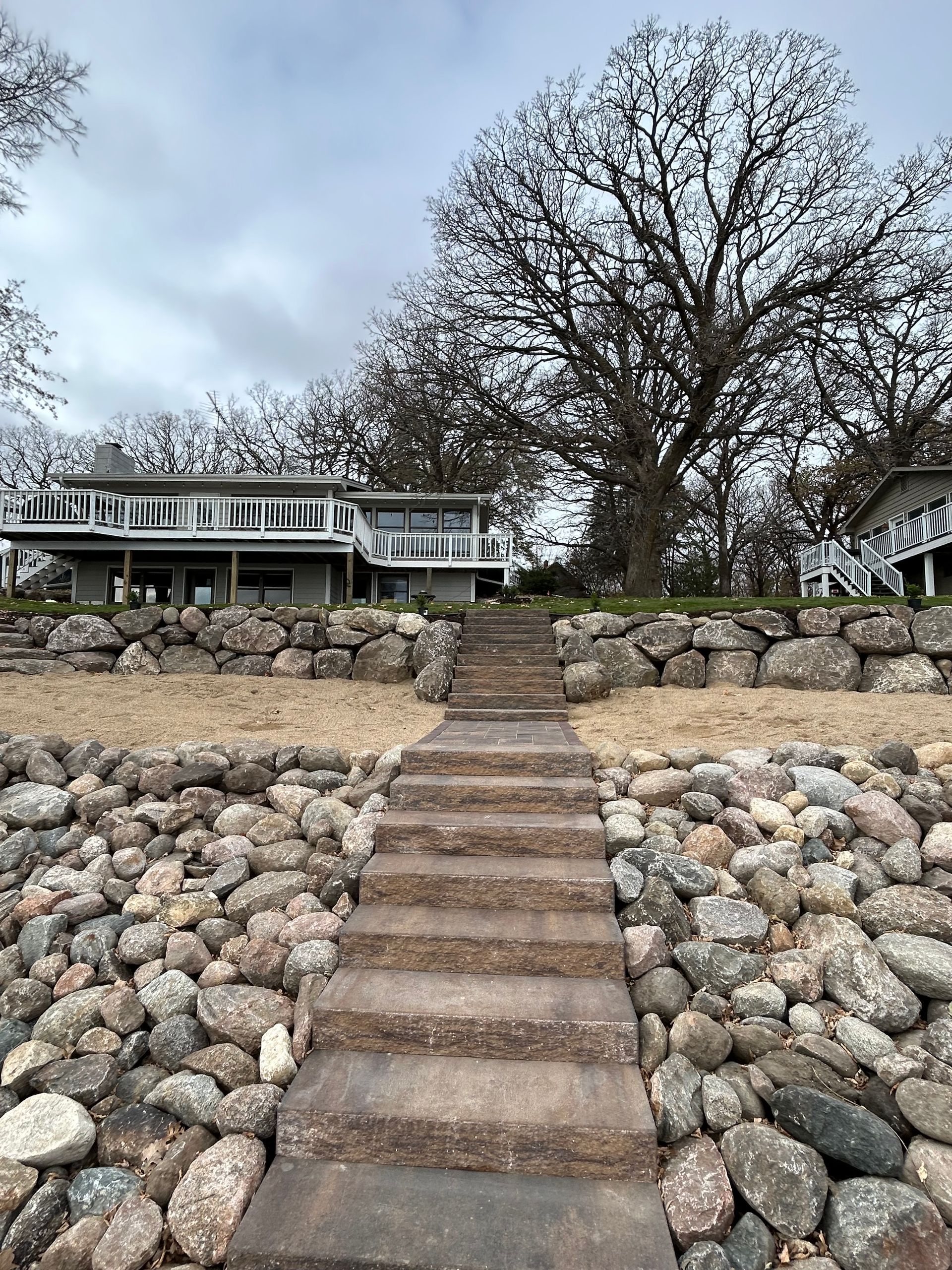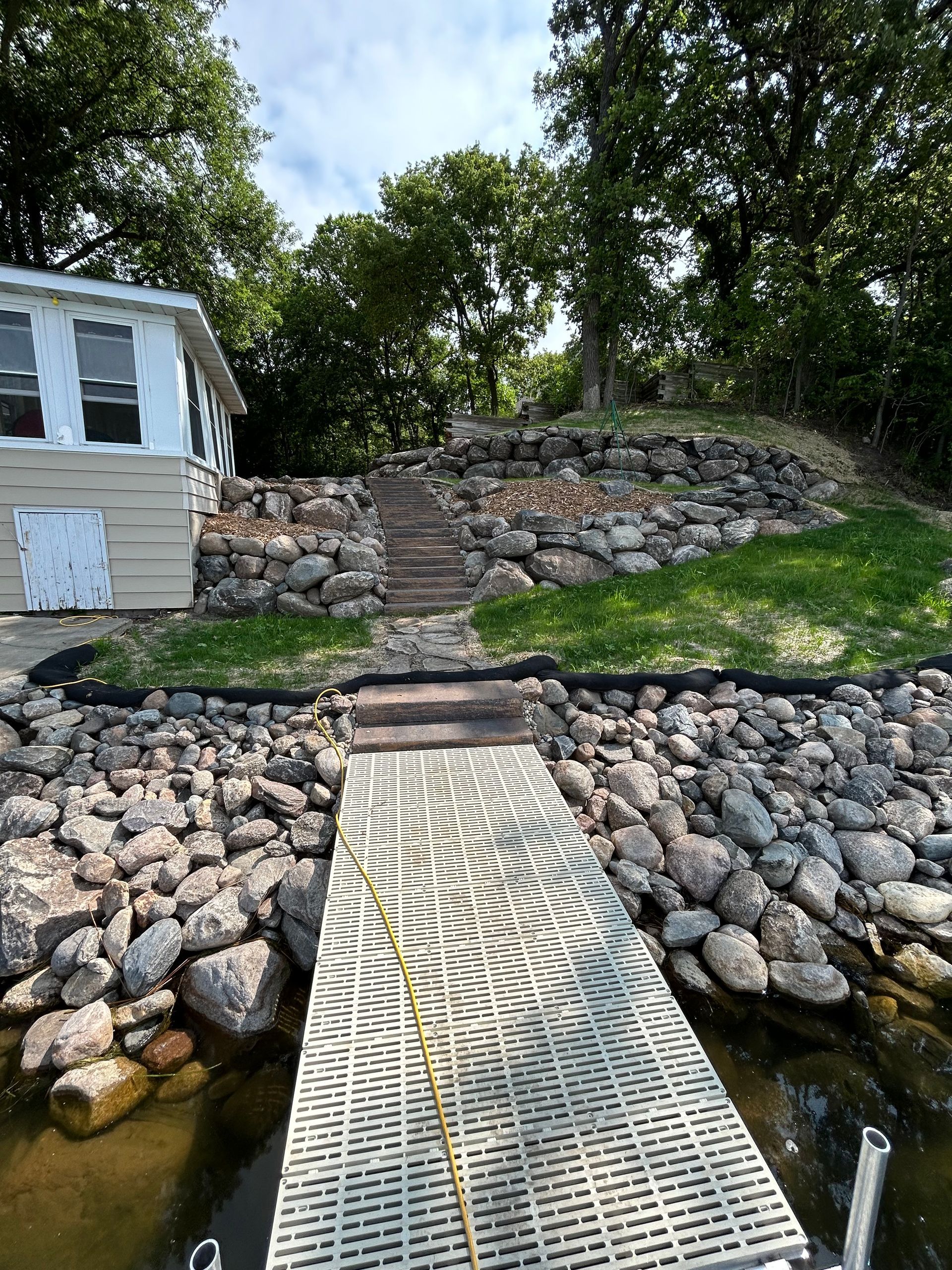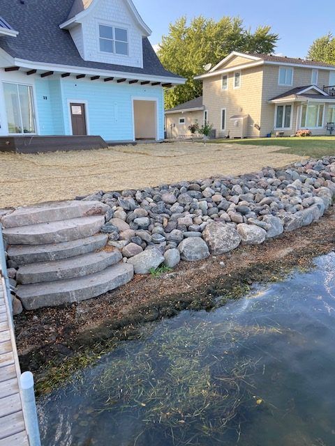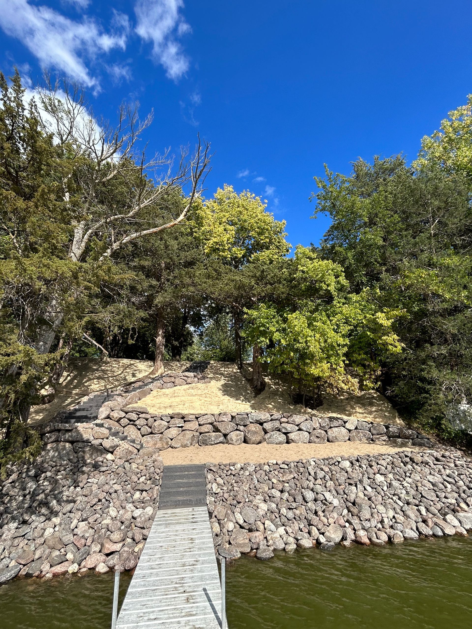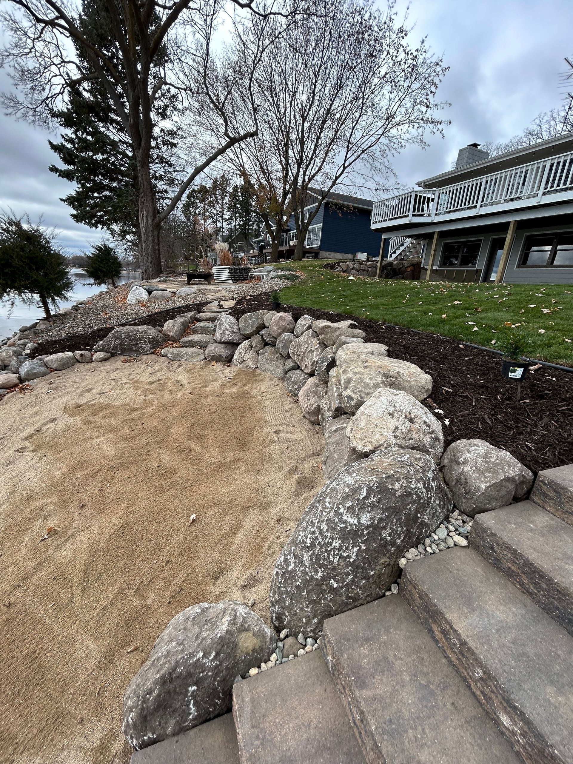 We strategically design landscaping using natural materials like rock to restore your shoreline and reduce erosion and flooding. Check out some restored shorelines to see the impact restoration can have, including a more functional shoreline space for clients’ homes.